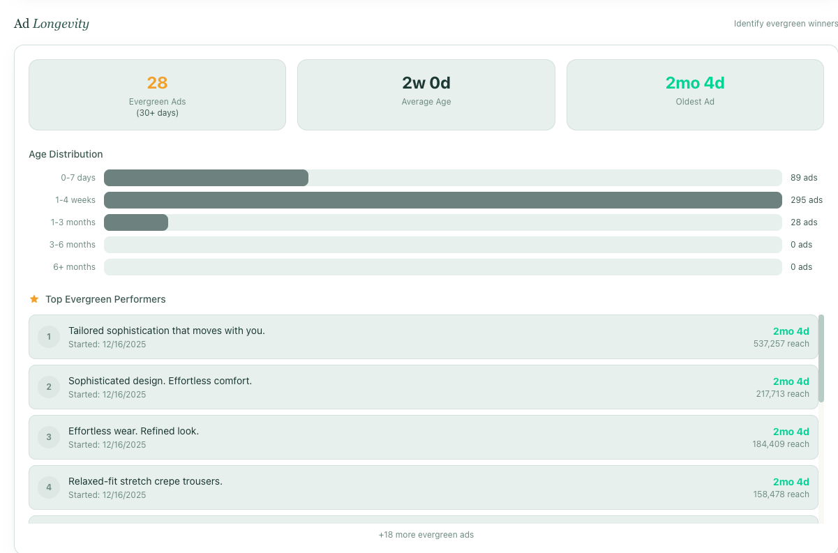 Istället för att manuellt bläddra genom Meta Ad Library kan du snabbt kartlägga konkurrenternas kreativa strategi och identifiera luckor i ditt eget bibliotek. Kör de mycket UGC men du har ingen? Satsar de hårt på Reels medan du bara kör statiskt? Då vet du var du behöver investera härnäst.