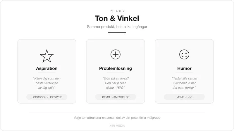 Poängen är att varje pelare öppnar nya "vägar" för algoritmen. Om du bara kör polerade produktvideor med samma ton har Meta i princip bara ett verktyg att jobba med. Men om du kombinerar format, ton, köpresefas, visuell stil och avsändare multiplicerar du antalet distinkta signaler – och det är precis vad Andromeda belönar.