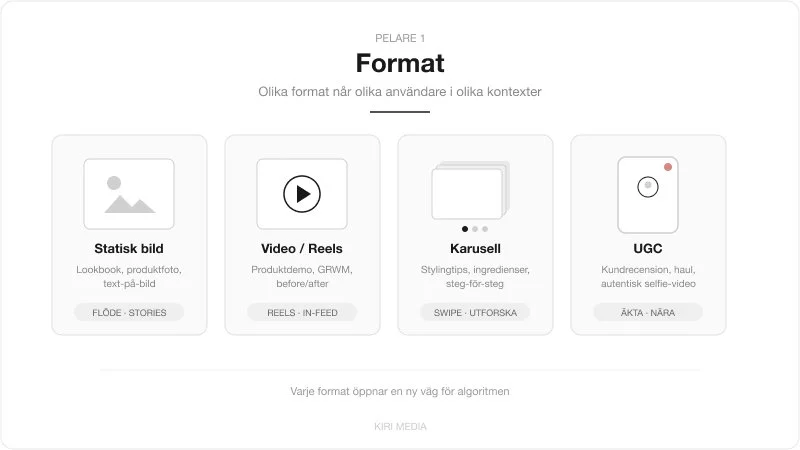 Olika format når olika användare i olika kontexter. En person som scrollar snabbt genom Stories reagerar på annat än någon som sitter och bläddrar i sitt flöde.